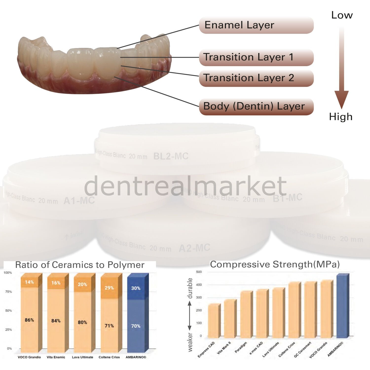 - Ideal Hardness: According to Vickers hardness tests, AMBARINO® High-Class has a softer structure even than natural dentin. This eliminates the "clicking" sensation caused by ceramics and maximizes patient comfort by offering both a better feel and a better sound.
