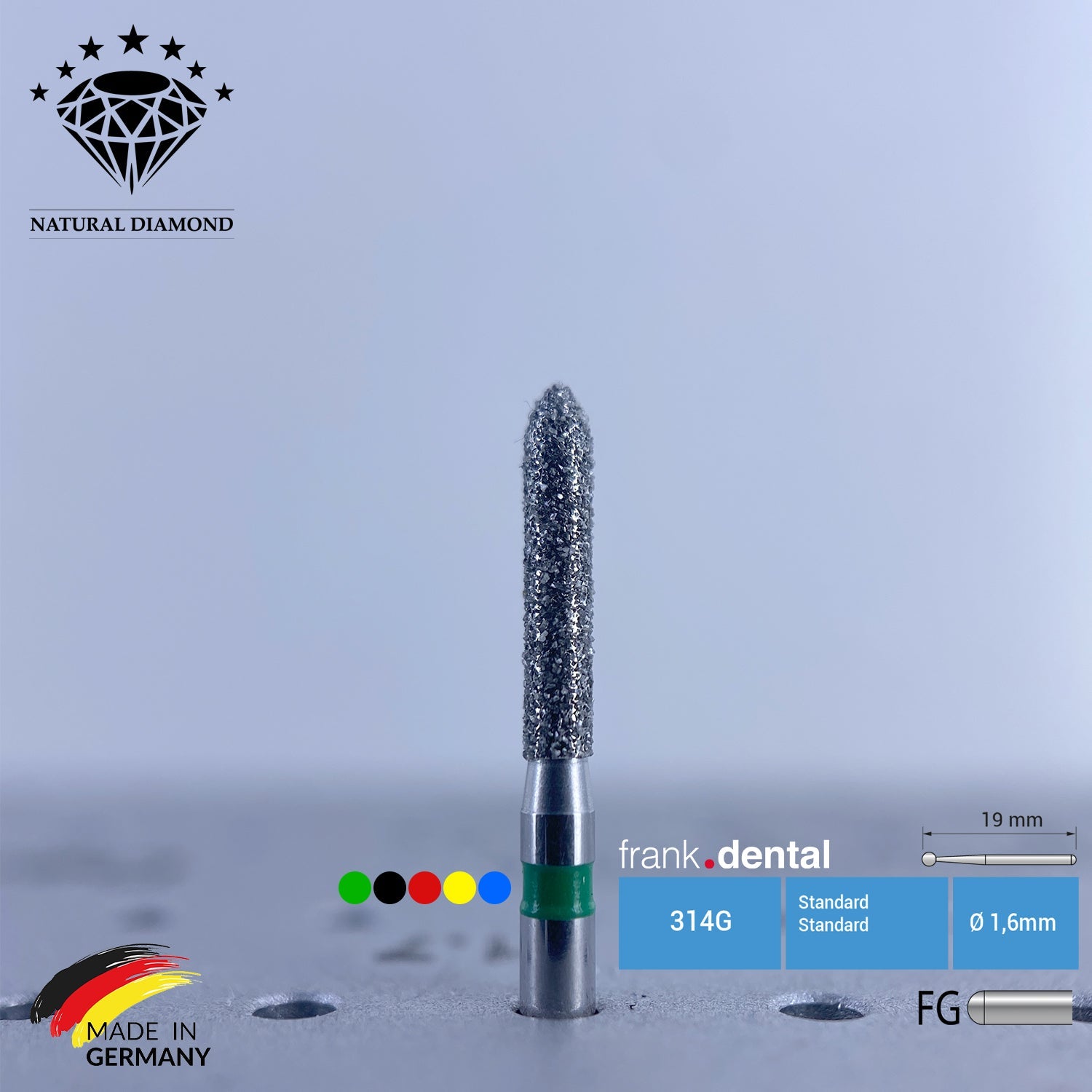 Diamond dental burs: Diamond is the hardest natural material known to man and, therefore, is the material of choice when it comes to wearing down the hardest tissue in the human body: tooth enamel. Diamond burs have a steel shank and an active part coated with natural or synthetic diamond powder. The vast majority of commercially available dental burs are made of synthetic diamond and it is less common to come across natural diamond burs. Manufacturers who use natural diamond usually emphasise this characteristic, as it gives the burs greater quality, efficiency and durability. Of course, the cost of a natural diamond burr is higher than that of a synthetic diamond burr.